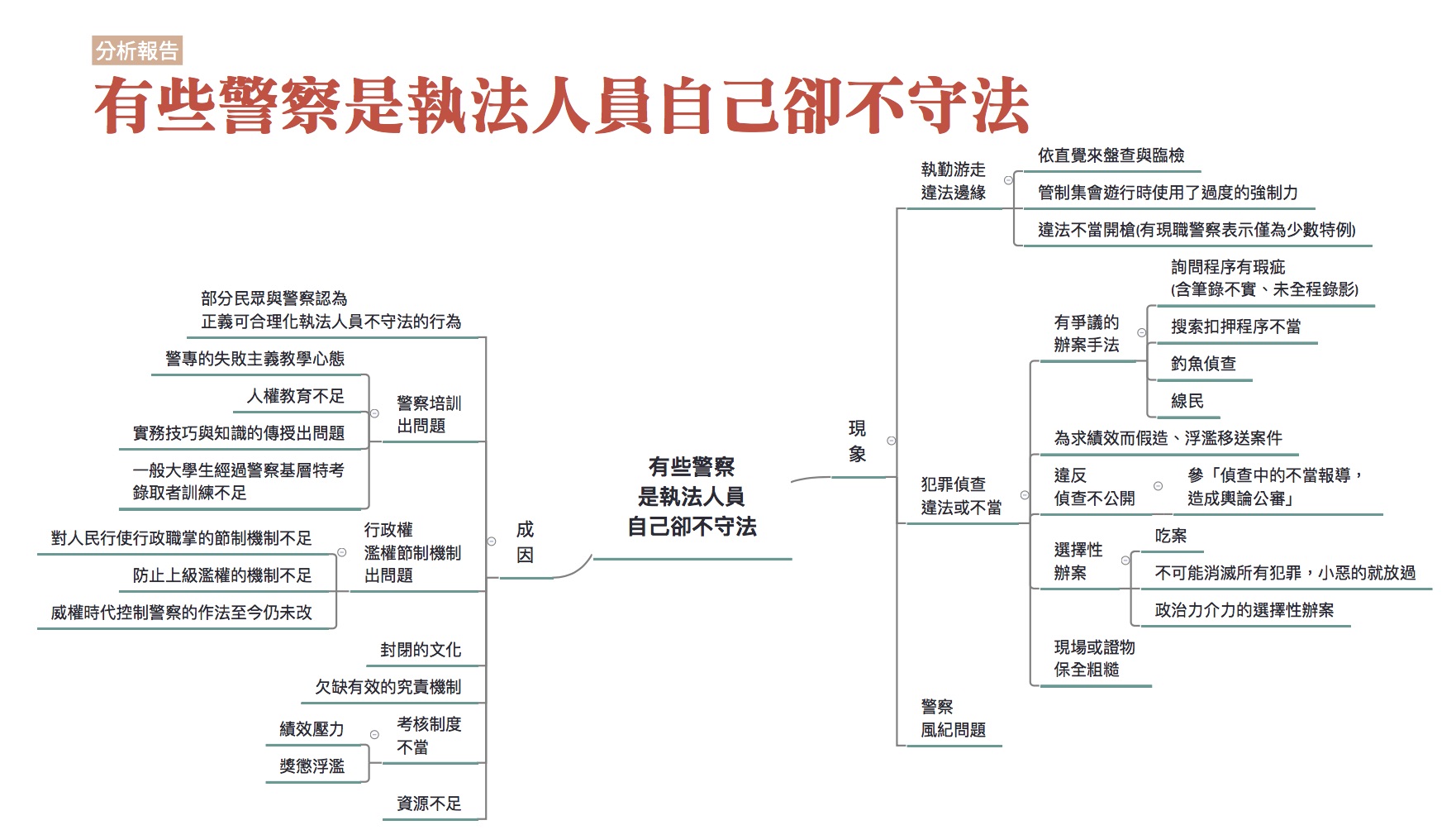 本報告分析的範圍涵蓋整個「有些警察是執法人員自己卻不守法」。但是由於大家在討論這個問題時,時常跳到其他警察制度的問題,這些問題雖然不在原本的討論範圍內,但本身相當重要又與警察執法狀況相關,因此在本彙整報告中,也會呈現這個部分。